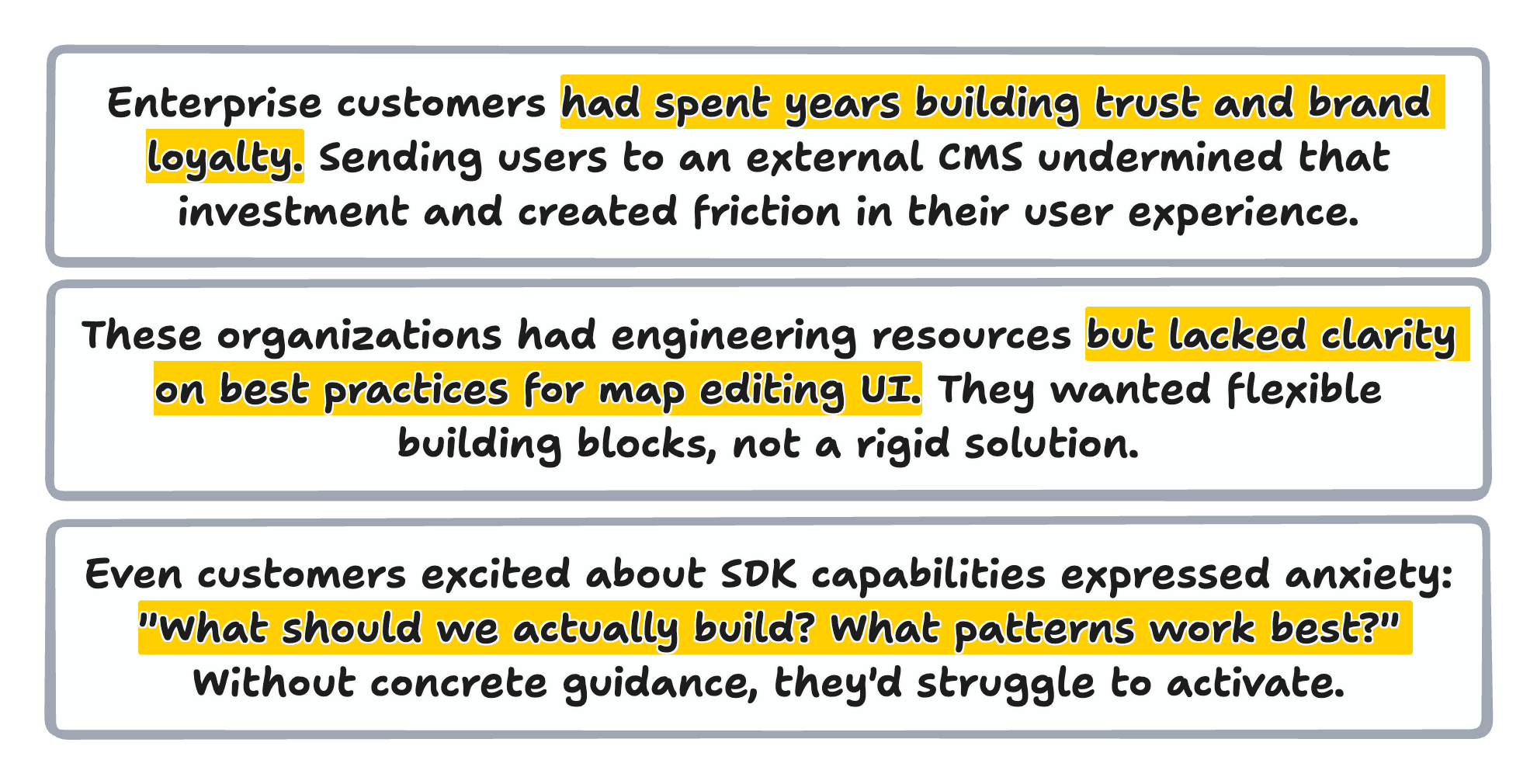 Through the interviews, a pattern emerged: enterprise customers didn't want our UI—they wanted our map editing capabilities wrapped in their UI. The SDK approach gave them that power while our design guidance would reduce their time-to-value.